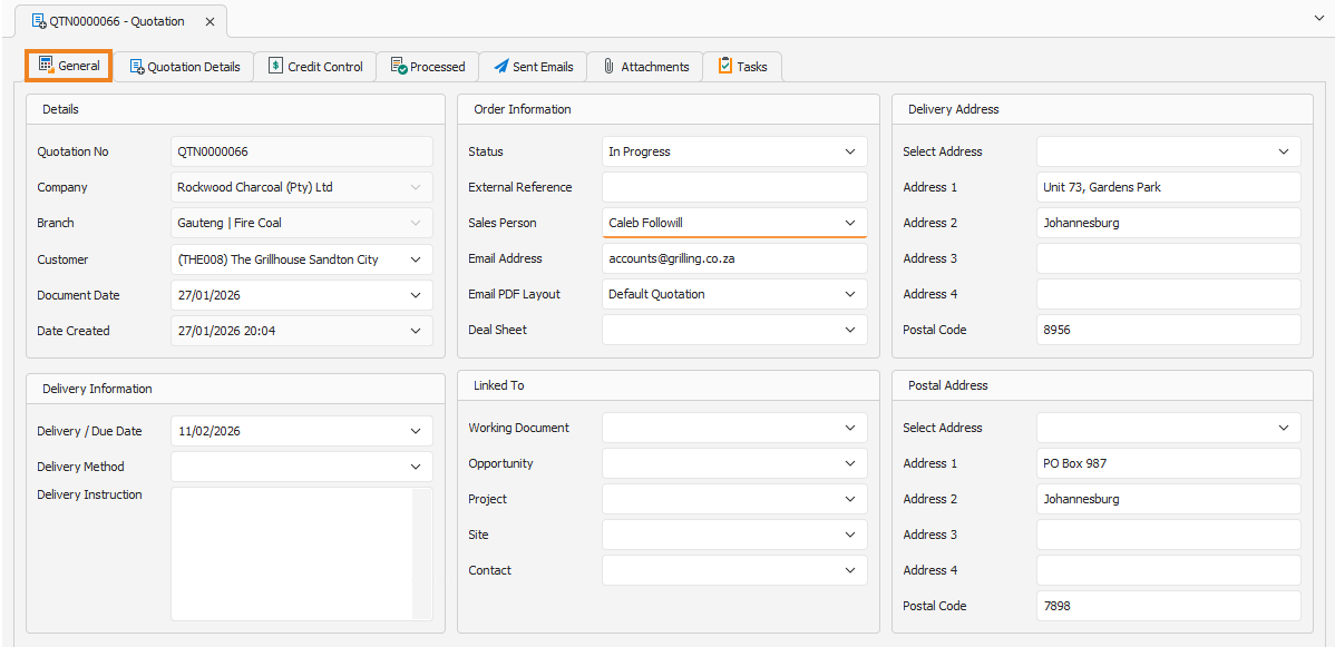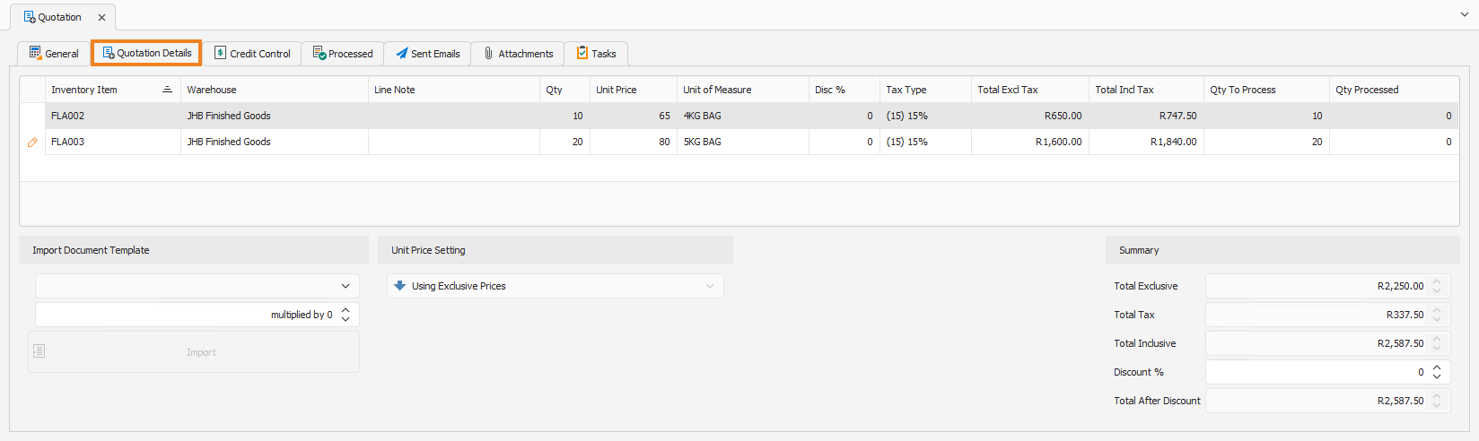 You can update some of the fields, if required. Once done, click the Quotation Details tab to continue.