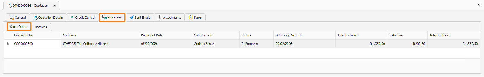 The Processed tab displays the sales orders and invoices that have been generated from this quotation. By default, the Sales Orders tab is displayed.