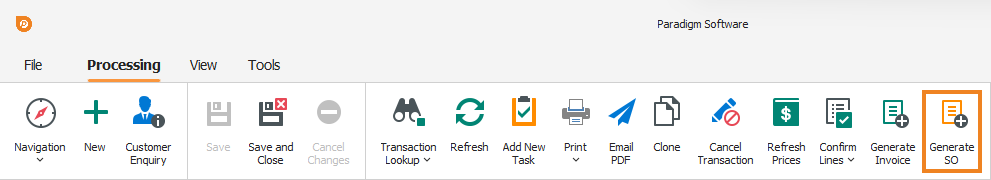 Once all item quantities have been updated or verified, click Generate SO on the toolbar.