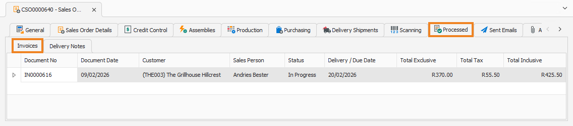 The Processed tab displays the sales orders and invoices that have been generated from this sales order. By default, the Invoices tab is displayed.