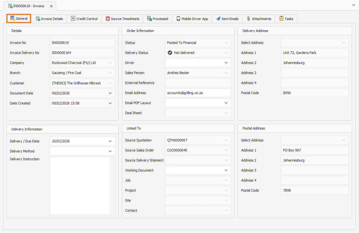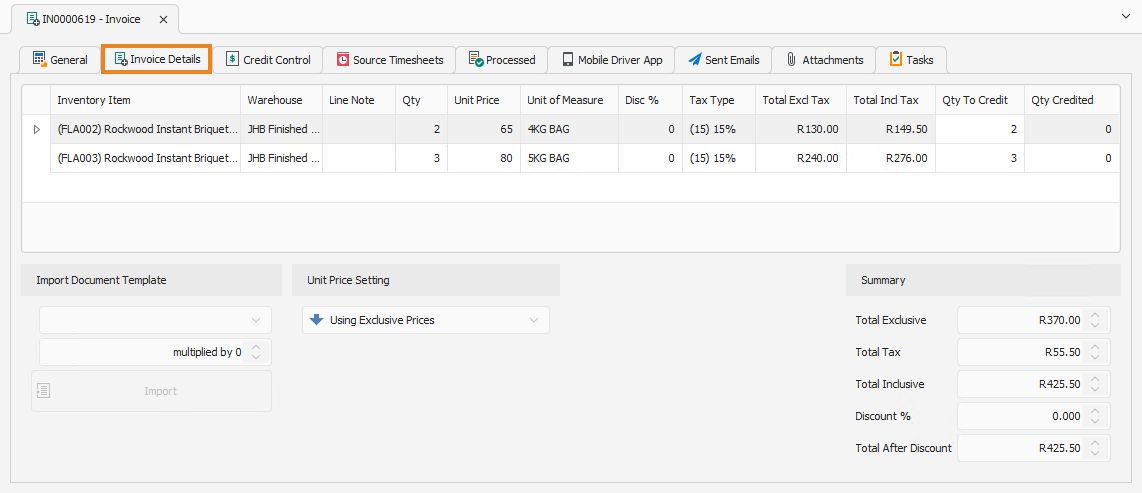 The Invoice Details tab displays the inventory items and quantities that have been invoiced and processed.