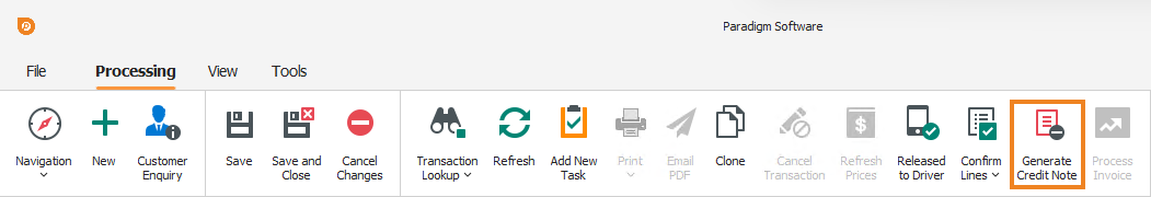 Once all item quantities have been updated or verified, click Generate Credit Note on the toolbar.