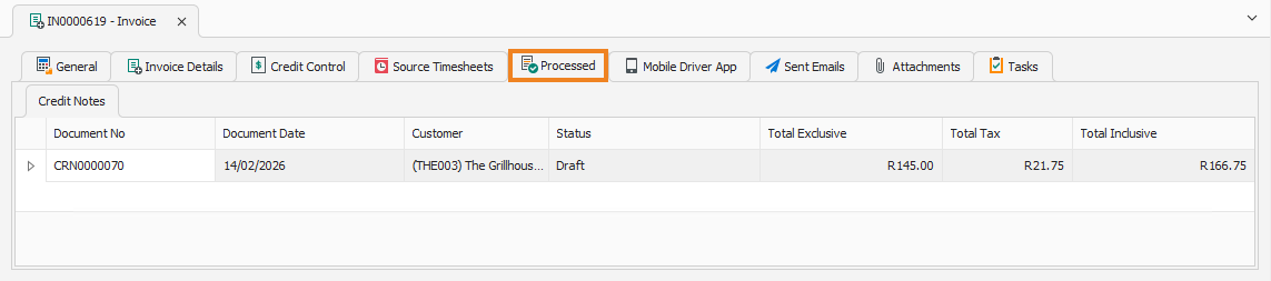 Click OK to close the popup and return to the invoice. Click the Processed Tab to display the generated credit notes for this invoice.