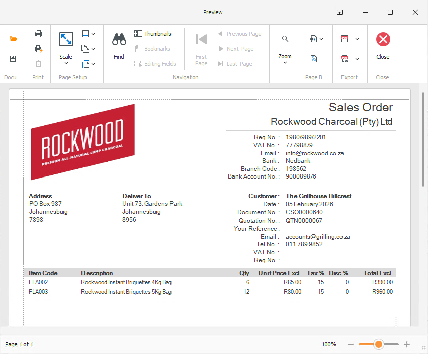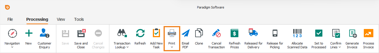 To print a sales transaction PDF document, click Print on the toolbar.