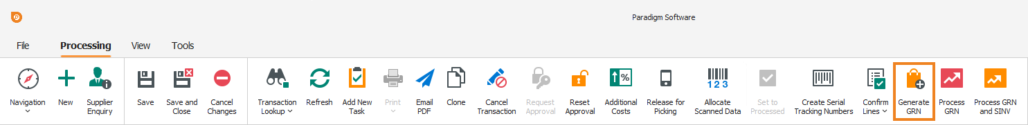 Once all item quantities have been updated or verified, click Generate GRN on the toolbar.