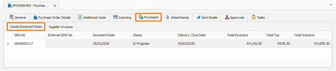 The Processed tab displays the GRNs and supplier invoices that have been generated from this purchase order. By default, the Goods Received Notes Orders tab is displayed.