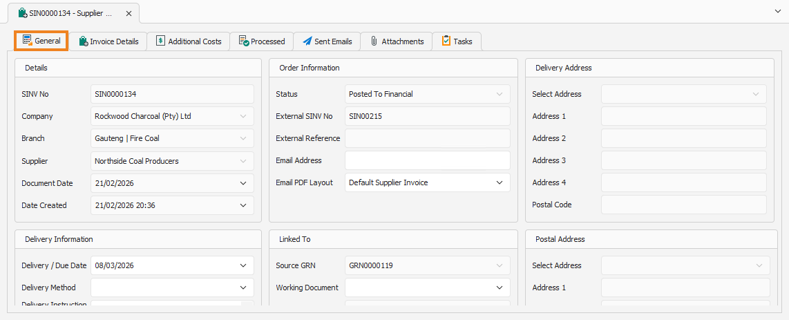 Opening the invoice displays its General tab.