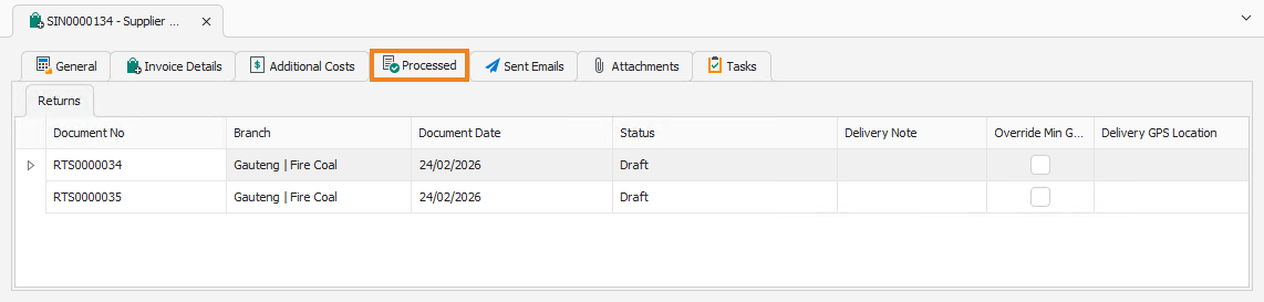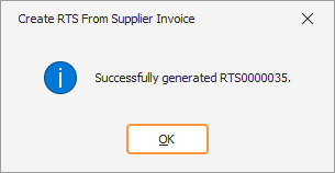Click OK to close the popup and return to the supplier invoice. Click the Processed Tab to display the generated RTSs for this invoice.