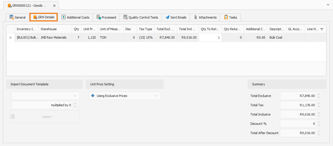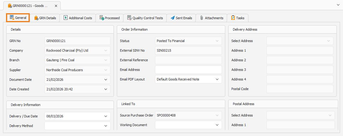 Opening the GRN displays its General tab.