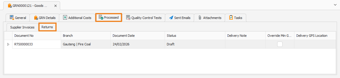 The Processed tab displays the RTSs that have been generated from this GRN. By default, the Supplier Invoices tab is displayed. Click the Returns tab to display the RTSs generated from this GRN.