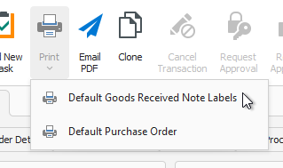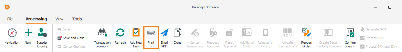 Note: For transactions that have a financial impact, such as purchase orders and goods received notes (GRNs), the document can only be printed if the transaction is processed and cannot be edited anymore.