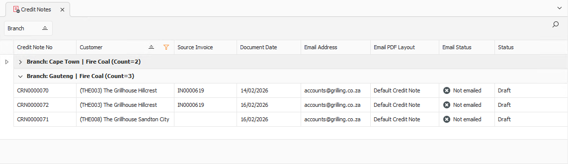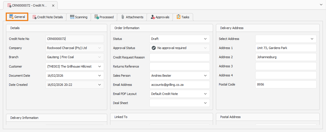Credit Note Details Tab